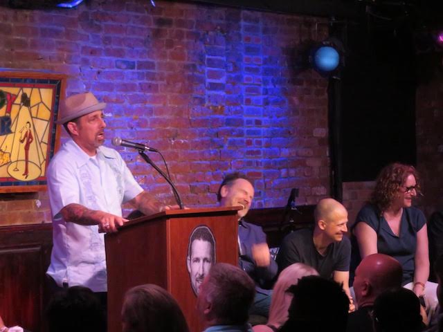 By about 8:15, the audience started to chant/clap “Vos, Vos, Vos” as they were anxious to get underway. The dais came out and from left to right it was , , , and . Then the podium with Bonnie McFarlane, and then , , , and . The show started with a friend of Bonnie’s singing an original, kind of sentimental song about Vos and his marriage to Bonnie, which was fodder for some of the comics to make fun of.