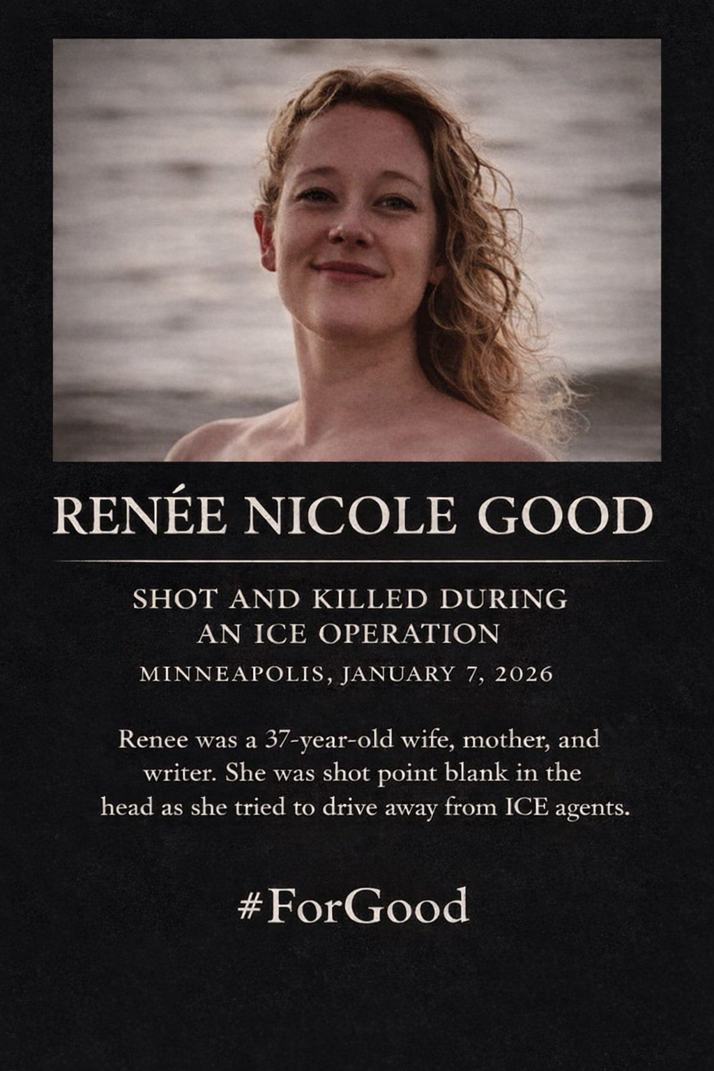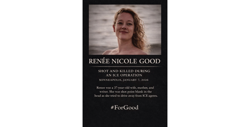 Renee Nicole Good was a prize-winning poet, wife, mother and respected member of her community. She was killed by an ICE agent while trying to protect her community. She had been trained as a first responder, a concerned citizen who appears when ICE is on the scene. A first responder is able to discern if ICE is unlawfully detaining someone. A first responder reports to a closed network that ICE is operating in an area to warn and protect innocent people. Let us stand up #ForGood.